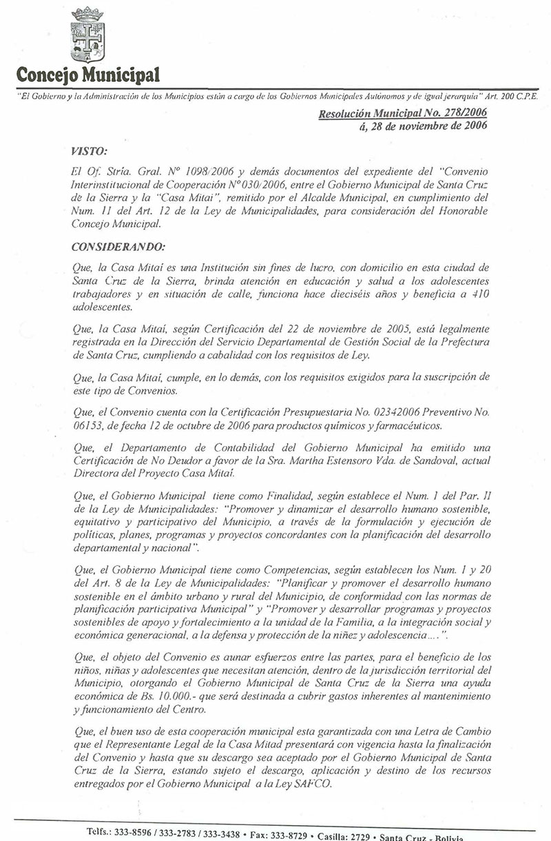 Se aprueba el Convenio Interinstitucional de Cooperación Nº 030/2006, entre el Gobierno Municipal de Santa Cruz de la Sierra y la Casa Mitai”, remitido por el Alcalde Municipal, en cumplimiento del Num. 11 del Art. 12 de la Ley de Municipalidades, para consideración del Honorable Concejo Municipal.