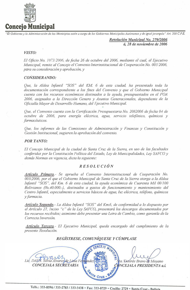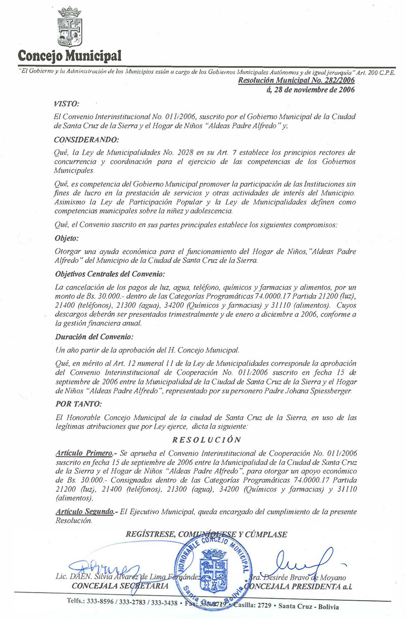 Se aprueba el Convenio Interinstitucional de Cooperación No. 011/2006 suscrito en fecha 15 de septiembre de 2006 entre la Municipalidad de la Ciudad de Santa Cruz de la Sierra y el Hogar de Niños “Aldeas Padre Alfredo”, para otorgar un apoyo económico de Bs. 30.000.- Consignados dentro de las Categorías Programáticas 74.0000.17 Partida 21200 (luz), 21400 (teléfonos), 21300 (agua), 34200 (Químicos y farmacias) y 31110 (alimentos).