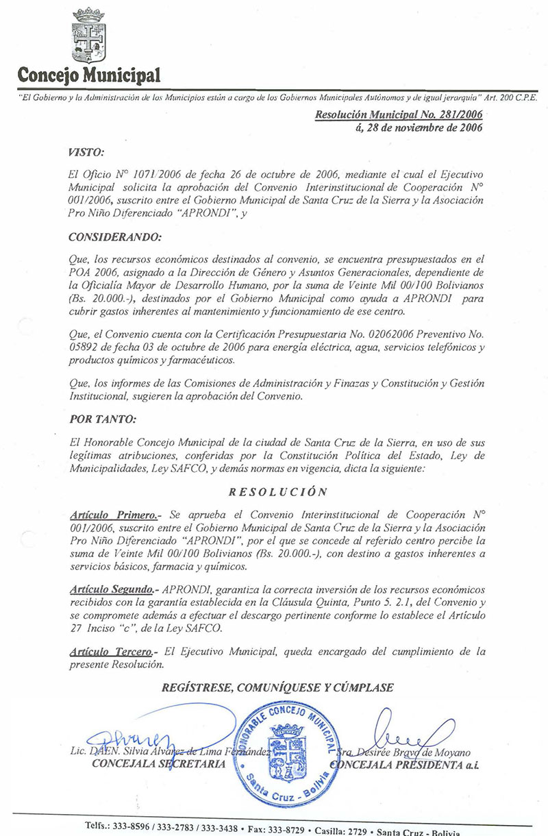 Se aprueba el Convenio Interinstitucional de Cooperación N° 001/2006, suscrito entre el Gobierno Municipal de Santa Cruz de la Sierra y la Asociación Pro Niño Diferenciado “APRONDI”, por el que se concede al referido centro percibe la suma de Veinte Mil 00/100 Bolivianos (Bs.20.000.-), con destino a gastos inherentes a servicios básicos, farmacia y químicos.