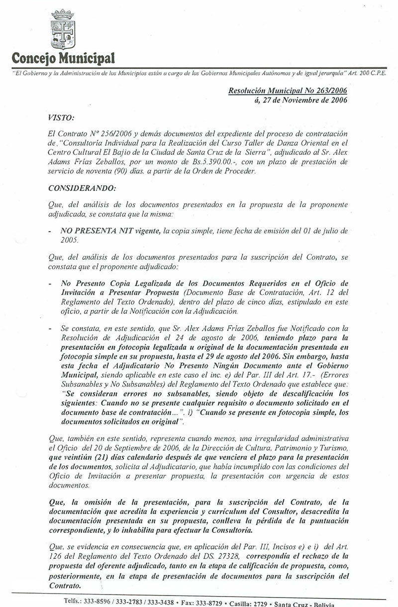 Se rechaza el Contrato Nº 256/2006, en atención y cumplimiento de la normativa que regula las contrataciones estatales, parágrafos I y III, incisos e) e i) del Art. 17 del Reglamento del Texto Ordenado, al evidenciarse el múltiple incumplimiento por parte del proponente adjudicado a las condiciones de la Convocatoria.