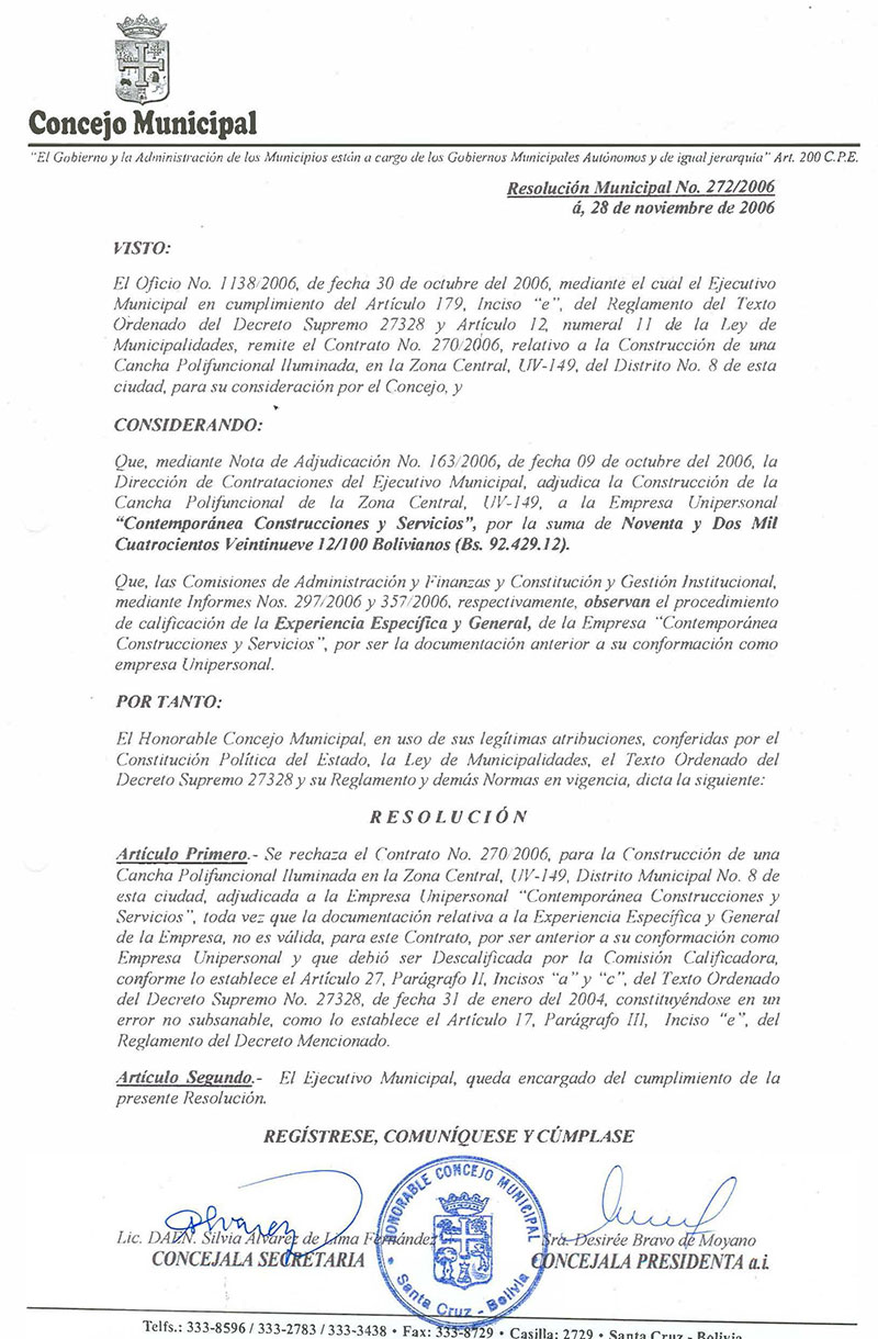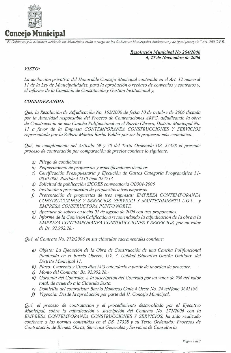 Se aprueba el Contrato No. 272/2006 con la EMPRESA CONTEMPORANEA CONSTRUCCIONES Y SERVICIOS para la ejecución de la Obra de Construcción de una Cancha Polifuncional Iluminada en el barrio Obrero, UV.3, Unidad Educativa Gastón Guillaux del Distrito Municipal 11, por un valor de Bs. 92.902.28.- consignados en la Categoría Programática 31-0050-000-Partida Presupuestaria 42230.