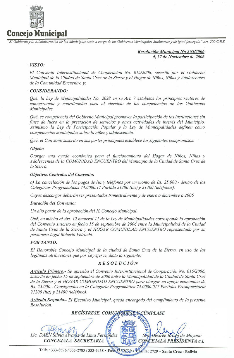 Se aprueba el Convenio Interinstitucional de Cooperación No. 015/2006, suscrito en fecha 15 de septiembre de 2006 entre la Municipalidad de la Ciudad de Santa Cruz de la Sierra y el HOGAR COMUNIDAD ENCUENTRO para otorgar un apoyo económico de Bs. 25.000.- Consignados en la Categoría Programática 74.0000.017 Partidas Presupuestaria 21200 (luz) y 21400 (teléfono).