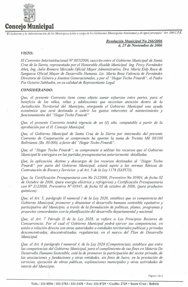 Se aprueba el aprueba el Convenio Interinstitucional de Cooperación Nº 007/2006, suscrito entre el Gobierno Municipal de Santa Cruz de la Sierra y el “HOGAR TECHO PINARDI”, suscrito el 15 de Septiembre del 2006.