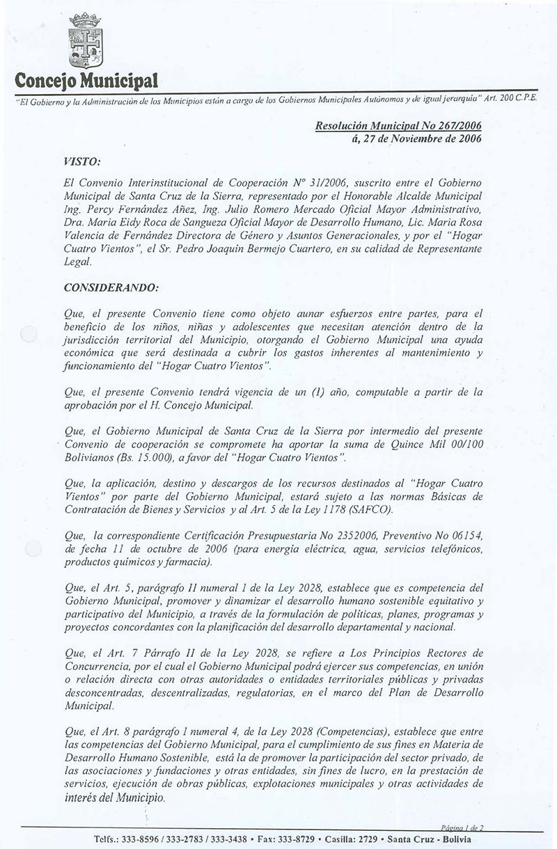 Se aprueba el Convenio Interinstitucional de Cooperación Nº 31/2006, suscrito entre el Gobierno Municipal de Santa Cruz de la Sierra y el “HOGAR CUATRO VIENTOS”, suscrito el 15 de Septiembre del 2006.