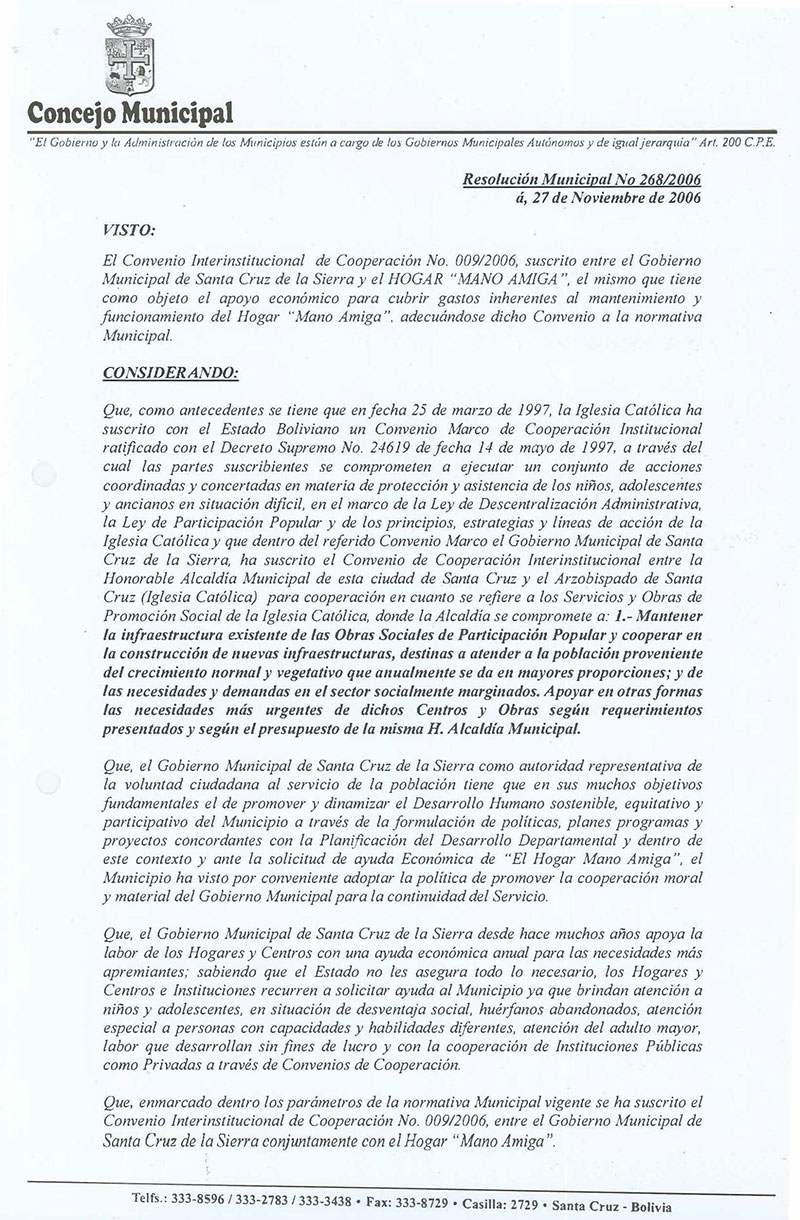 Se aprueba el Convenio Interinstitucional de Cooperación No. 009/2006, suscrito entre el Gobierno Municipal de Santa Cruz de la Sierra y el Hogar “Mano Amiga”, el mismo que tiene como objeto el apoyo económico para cubrir gastos inherentes al mantenimiento y funcionamiento del Hogar, adecuándose dicho convenio a la normativa Municipal.