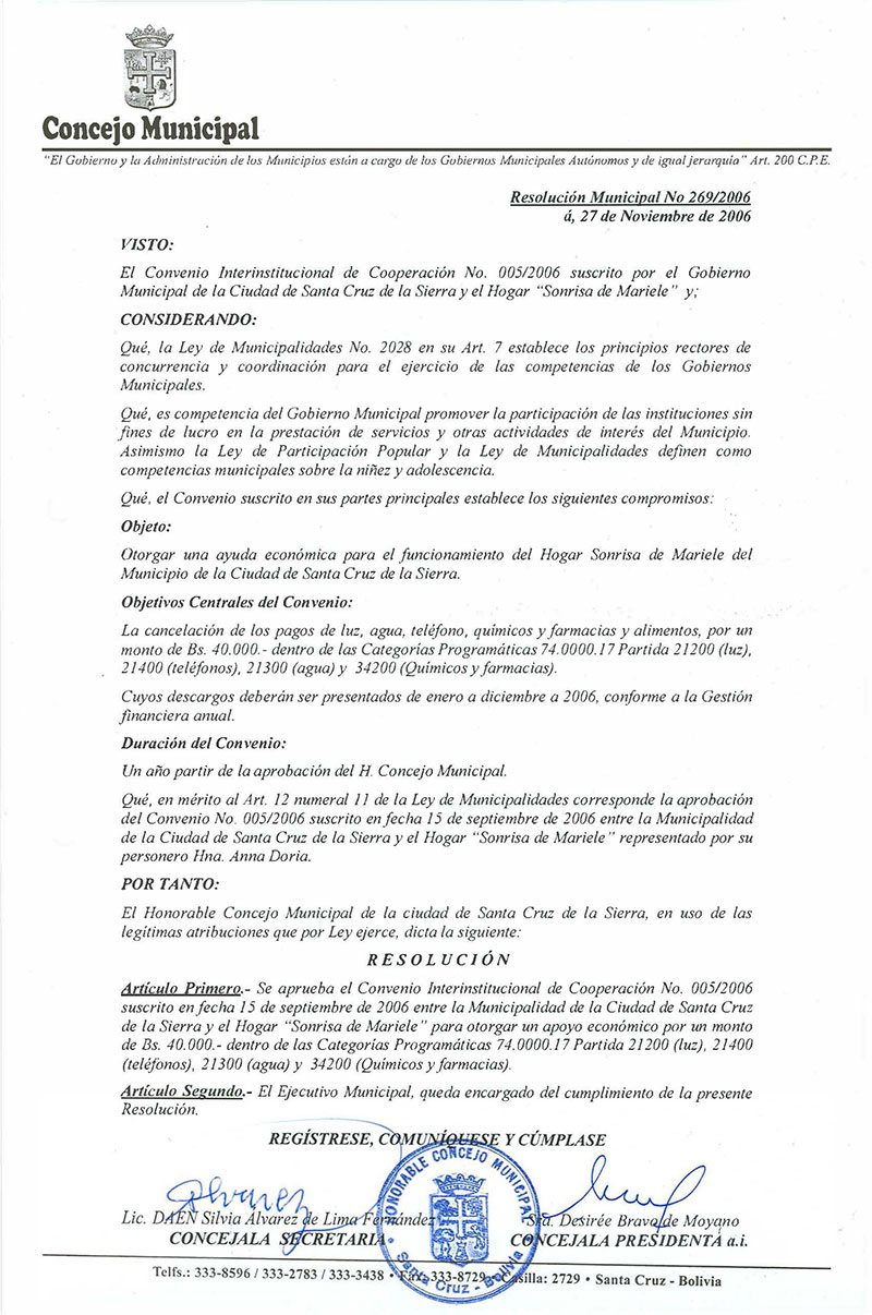 Se aprueba el Convenio Interinstitucional de Cooperación No. 005/2006 suscrito en fecha 15 de septiembre de 2006 entre la Municipalidad de la Ciudad de Santa Cruz de la Sierra y el Hogar “Sonrisa de Mariele” para otorgar un apoyo económico por un monto de Bs. 40.000.- dentro de las Categorías Programáticas 74.0000.17 Partida 21200 (luz), 21400 (teléfonos), 21300 (agua) y 34200 (Químicos y farmacias).