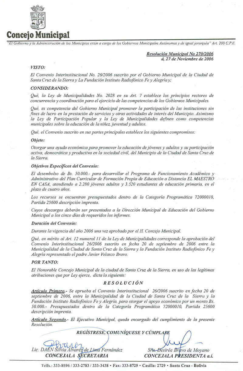 Se aprueba el Convenio Interinstitucional 26/2006, suscrito en fecha 20 de septiembre de 2006, entre la Municipalidad de la Ciudad de Santa Cruz de la Sierra y la Fundación Instituto Radiofónico Fe y Alegría, para otorgar el apoyo económico por un monto Bs. 50.000.- Presupuestados dentro de la Categoría Programática 72000010, Partida 25600 descripción imprenta.
