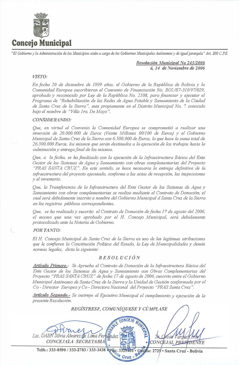 Se aprueba el Contrato de Donación de la Infraestructura Básica del Entre Gestor de los Sistemas de Agua y Saneamiento con Obras Complementarias del Proyectos PRAS SANTA CRUZ, de fecha 17 de agosto de 2006, suscrito entre el Gobierno Municipal Autónomo de Santa Cruz de la Sierra, y la Unidad de Gestión conformada por el Co-Director Europeo y Co-Directora Nacional del Proyecto PRAS Santa Cruz.