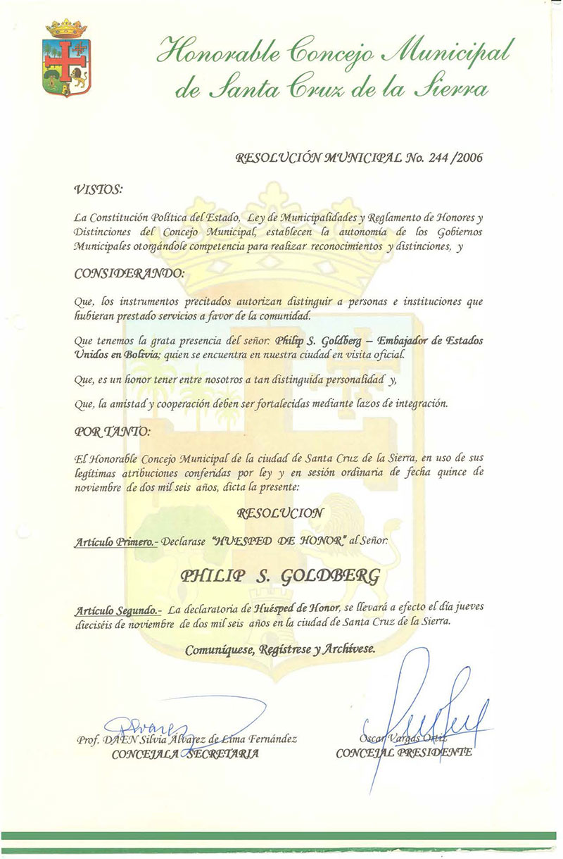 Se declara Husped de Honor al Señor Philip S. Goldberg, Embajador de Estados unidos en Bolivia.