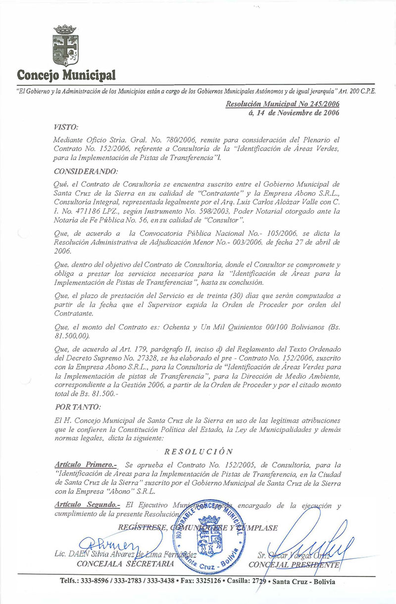 Se aprueba el Contrato No. 152/2006, de Consultoría, para la Identificación de Áreas para la Implementación de Pistas de Transferencias, en la ciudad de Santa Cruz de la Sierra, suscrito por el Gobierno Municipal de Santa Cruz de la Sierra con la Empresa Abono S.R.L.