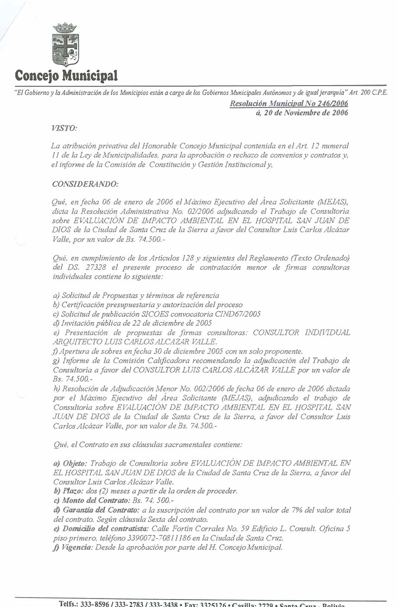Se aprueba el Contrato de Consultoría Individual No. 217/2006, suscrito con el Consultor Arquitecto Luís Carlos Alcázar Valle para la realización del Trabajo de Consultoría Evaluación del Impacto Ambiental en el Hospital San Juan de Dios de la ciudad de Santa Cruz de la Sierra, por un monto de Bs.- 74.500.- consignados en la Partida Presupuestaria No. 25800 Categoría Programática 44.0053.00.