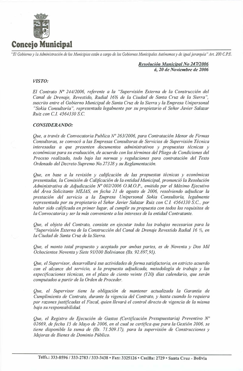 Se aprueba el Contrato Nº 244/2006, referente a la “Supervisión Externa de la Construcción del Canal de Drenaje, Revestido, Radial 16½ de la Ciudad de Santa Cruz de la Sierra”, suscrito entre el Gobierno Municipal de Santa Cruz de la Sierra y la Empresa Unipersonal “Sokia Consultoría”.