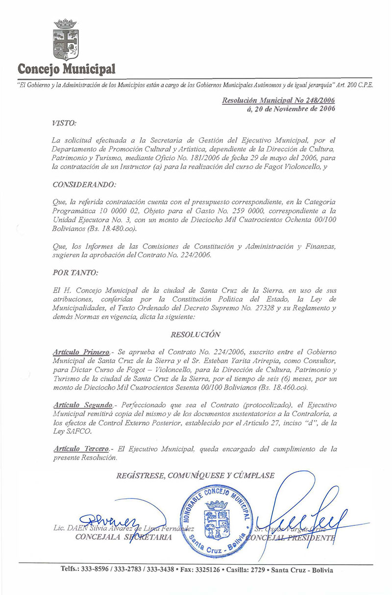 Se aprueba el Contrato No. 224/2006, suscrito entre el Gobierno Municipal de Santa Cruz de la Sierra y el Sr. Esteban Yarita Arirepia, como Consultor, para Dictar Curso de Fogot – Violoncello, para la Dirección de Cultura, Patrimonio y Turismo de la ciudad de Santa Cruz de la Sierra, por el tiempo de seis (6) meses, por un monto de Dieciocho Mil Cuatrocientos Sesenta 00/100 Bolivianos (Bs.- 18.460.00.-).