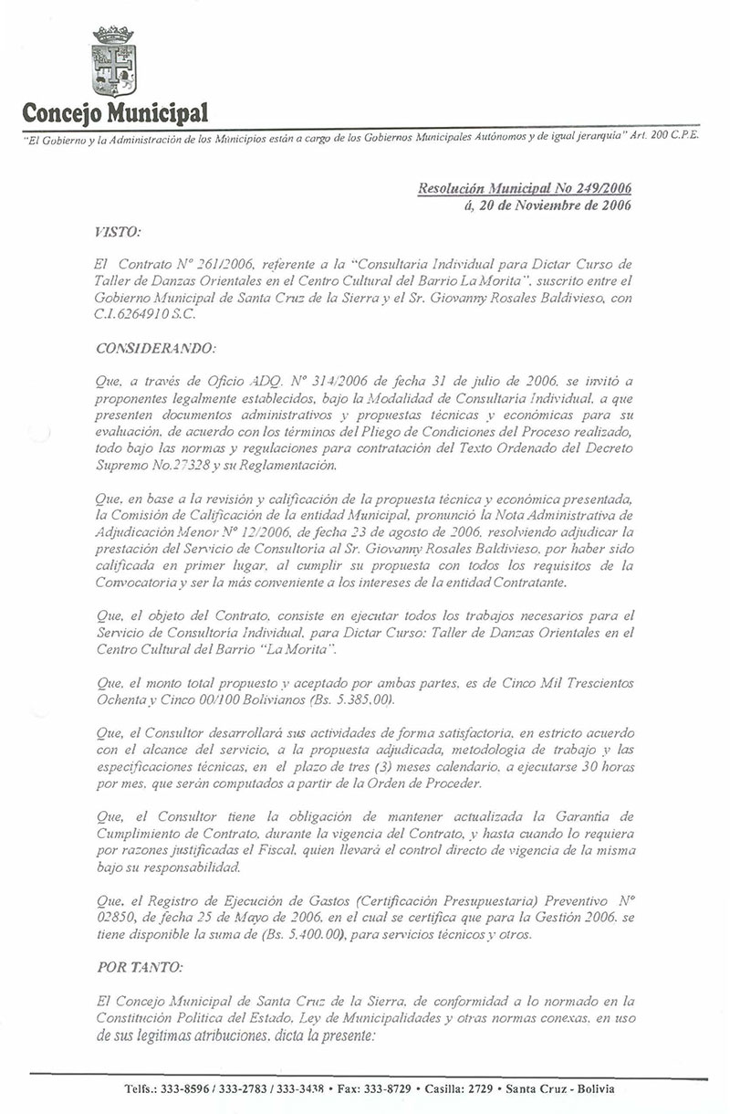 Se aprueba el Contrato No. 261/2006, referente a la Consultaría Individual para Dictar Cursos de Taller de Danzas Orientales en el Centro Cultural del Barrio La Morita, suscrito entre el Gobierno Municipal de Santa Cruz de la Sierra y el Sr. Giovanny Rosales Valdivieso.