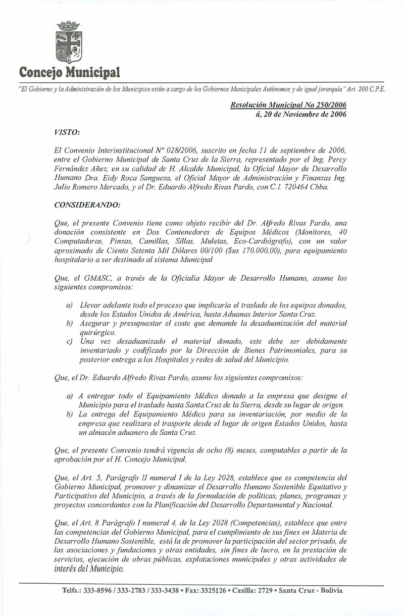 Se aprueba el Convenio de Cooperación Interinstitucional No. 028/2006, suscrito en fecha 11 de septiembre de 2006, entre el Gobierno Municipal de Santa Cruz de la Sierra, representado por el Ing. Percy Fernández Añez, en su calidad de H. Alcalde Municipal, la Oficial Mayor de Desarrollo Humano Dra. Eidy Roca Sangueza, el Oficial Mayor de Administración y Finanzas Ing. Julio Romero Mercado, y el Dr. Eduardo Alfredo Rivas Pardo, con C.I. 720464 Cbba.