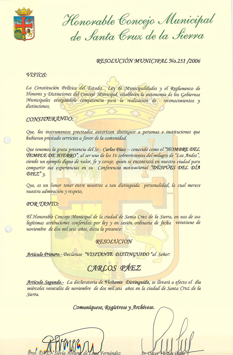 Se declare Visitante Distinguido al Señor Carlos Paez, conocido como el Hombre del Temple de Hierro, sobreviviente de la tragedia de los Andes.