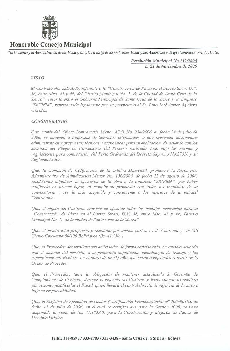 Se aprueba el Contrato No. 225/2006, referente a la Construcción de Plaza en el Barrio Sirari UV-58, entre Mza. 45 y 46 del Distrito Municipal No.1 de la ciudad de Santa Cruz de la Sierra, suscrito entre el Gobierno Municipal de Santa Cruz de la Sierra y la Empresa SICPEM.