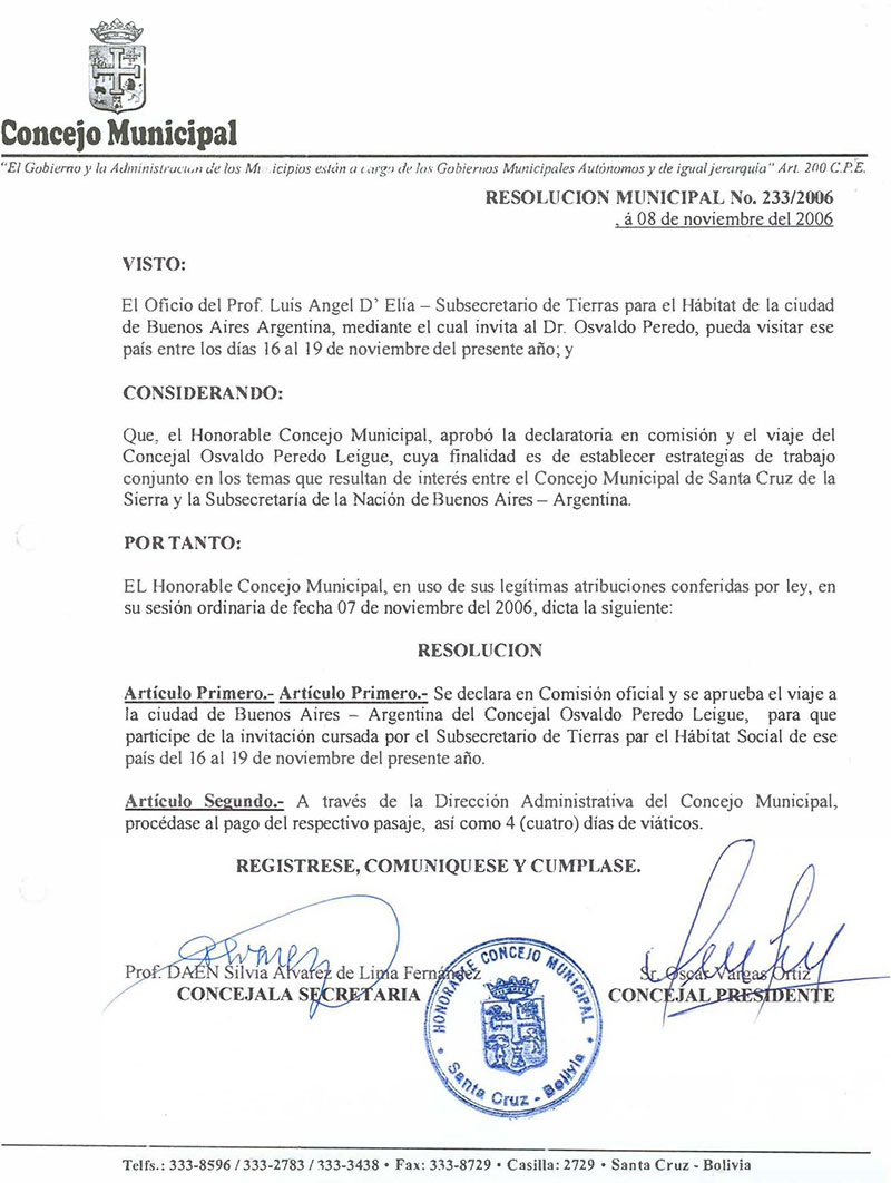Se declara en Comision Oficial y se aprueba el viaje a la ciudad de Buenos Aires - Argentina del Concejal Osvaldo Peredo, para que participe de la invitacion cursada por el Subsecretario de Tierras para el Habitat Social.