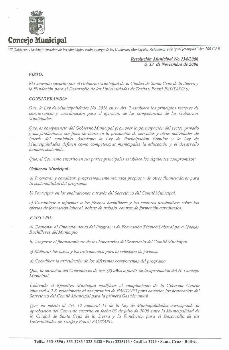Se aprueba el Convenio suscrito en fecha 5 de julio de 2006 entre la Municipalidad de la ciudad de Santa Cruz de la Sierra y la Fundación para el Desarrollo de las Universidades de Tarija y Potosí FAUTAPO, para la ejecución del Programa de Formación Técnica Laboral para Jóvenes Bachilleres, en el marco de la Estrategia Nacional del Programa de Formación y Empleo de Jóvenes en desventaja Social, en sus ocho cláusulas.