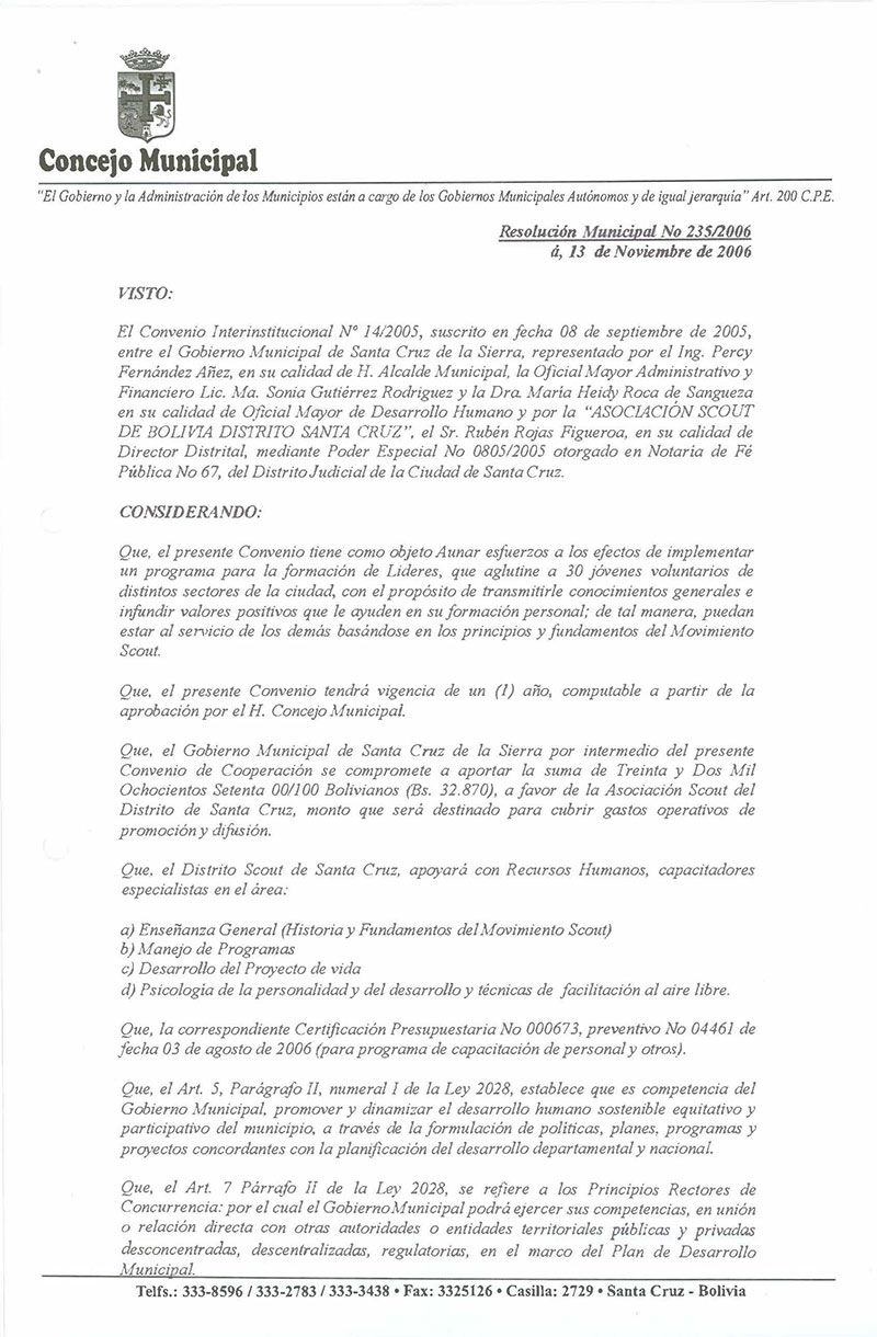 Se aprueba el Convenio Interinstitucional No. 14/2005, suscrito en fecha 08 de septiembre de 2005, entre el Gobierno Municipal de Santa Cruz de la Sierra, representado por el Ing. Percy Fernández Añez, en su calidad de H. Alcalde Municipal, la Oficial Mayor Administrativo y Financiero Lic. Ma. Sonia Gutiérrez Rodríguez, la Oficial Mayor de Desarrollo Humano Dra. María Heidy Roca de Sangueza, y por la Asociación Scout de Bolivia Distrito Santa Cruz, el Sr. Rubén Rojas Figueroa, en su calidad de Director Distrital.