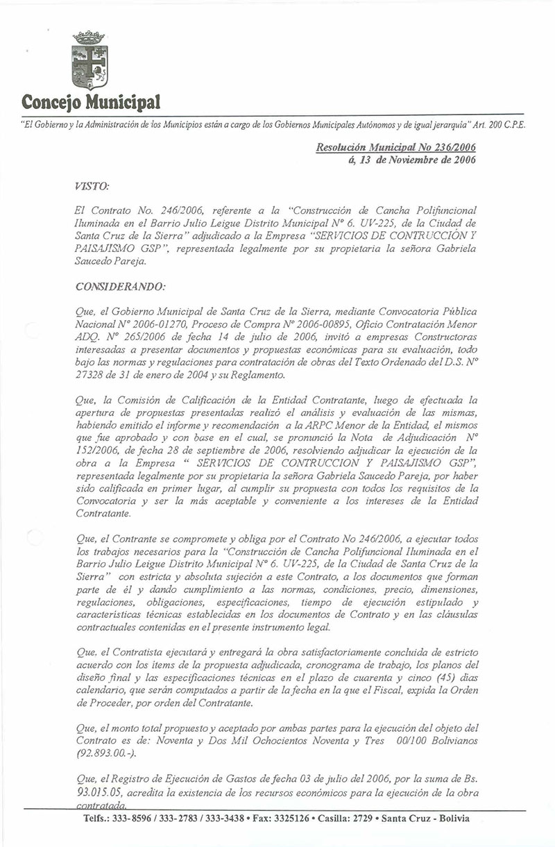Se aprueba el Contrato No. 246/2006, referente a la Construcción de Cancha Polifuncional Iluminada en el Barrio Julio Leigue, Distrito Municipal No.6, UV-225, de la ciudad de Santa Cruz de la Sierra, adjudicado a la Empresa “Servicios de Construcción y Paisajismo GSP”, representada legalmente pro su propietaria la señora Gabriela Saucedo Pareja.