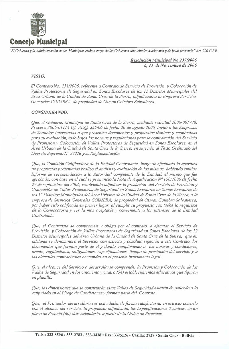 Se aprueba el Contrato No. 251/2006, referente al Servicio de Provisión y Colocación de Vallas Protectoras de Seguridad en zonas escolares de los 12 Distritos Municipales del área urbana de la ciudad de Santa Cruz de la Sierra, adjudicado a la Empresa Servicios Generales COIMBRA, de propiedad de Osman Coimbra Salvatierra.