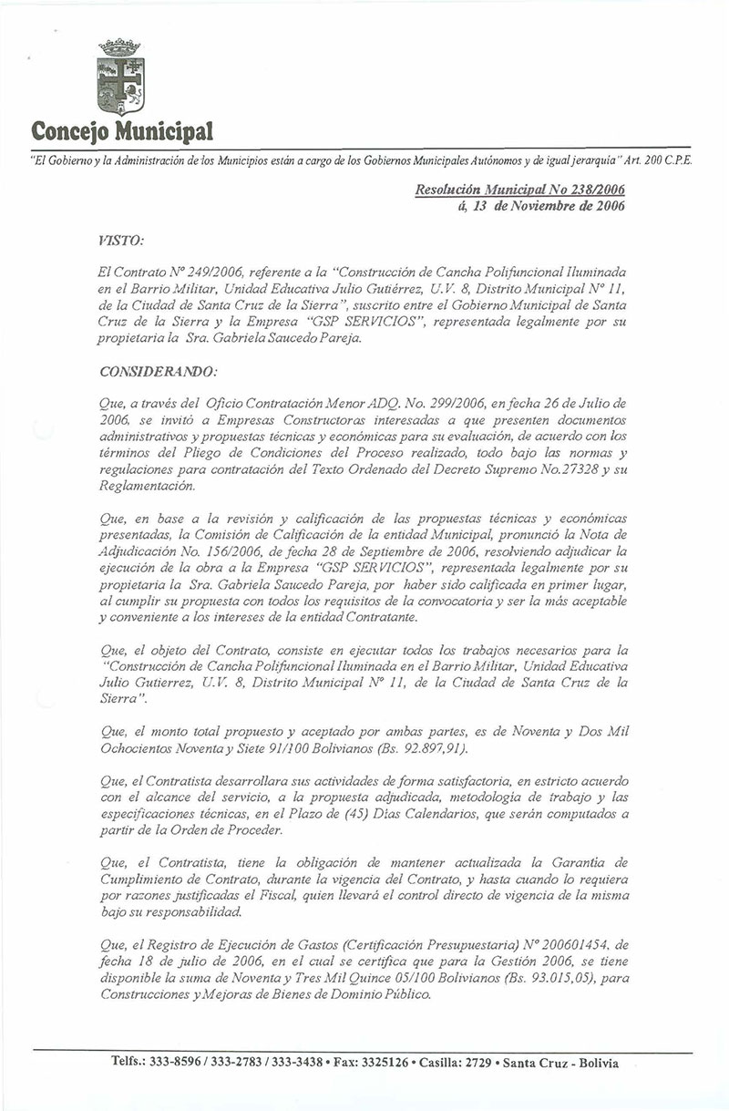 Se aprueba el Contrato No. 249/2006, referente a la Construcción de Cancha Polifuncional Iluminada en el Barrio Militar, Unidad Educativa Julio Gutiérrez, UV-8, Distrito Municipal No.11, de la ciudad de Santa Cruz de la Sierra, suscrito entre el Gobierno Municipal de Santa Cruz de la Sierra y la Empresa GSP SERVICIOS.