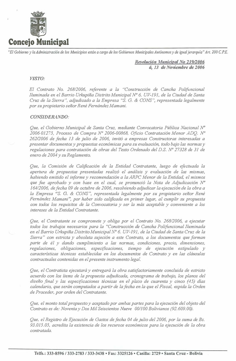 Se aprueba el Contrato No. 268/2006, referente a la Construcción de Cancha Polifuncional Iluminada en el Barrio Urkupiña, Distrito Municipal No. 6, UV-191, de la ciudad de Santa Cruz de la Sierra, adjudicado a la Empresa S.G.