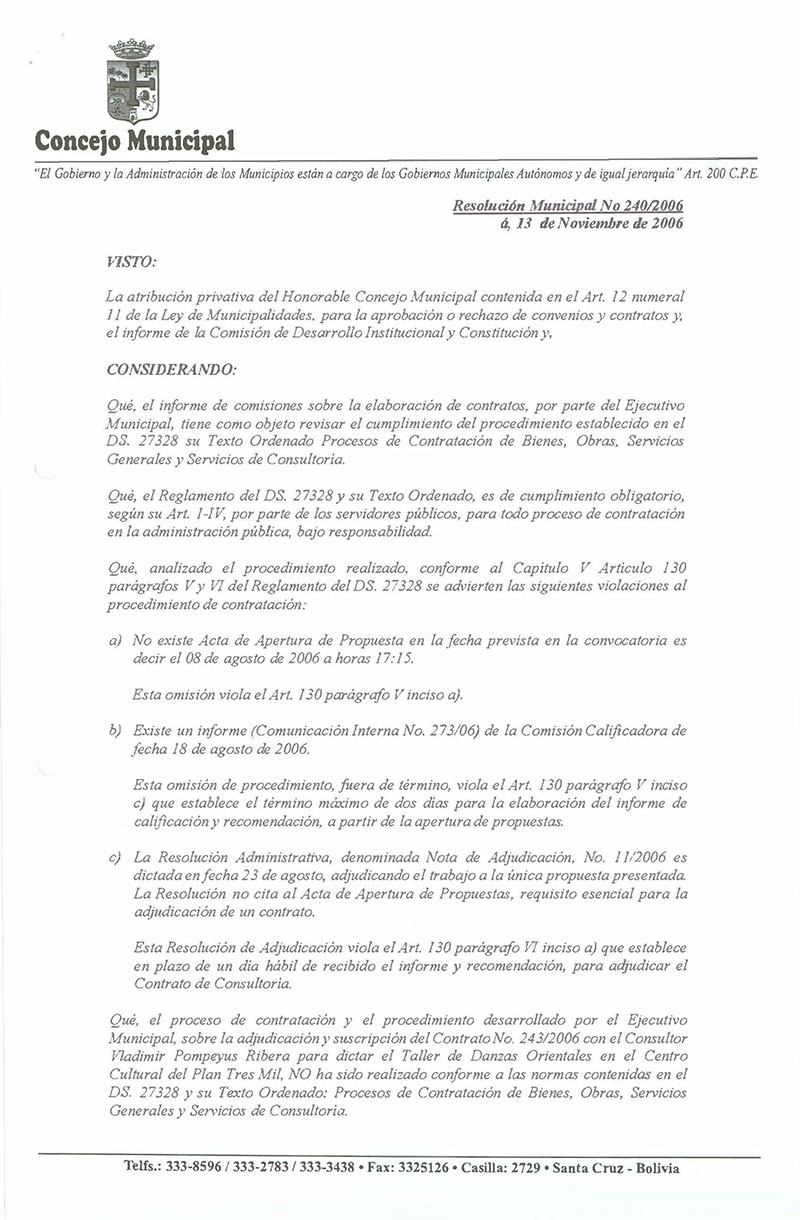 Se rechaza el Contrato No. 243/2006, adjudicado al Consultor Individual Vladimir Pompeyus Ribera, para dictar el Taller de Danzas Orientales en el Centro Cultural del Plan Tres Mil, por no haber sido realizado conforme a los procedimientos señalados en el Reglamento del D.S. 27328 y su Texto Ordenado, de cumplimiento obligatorio por parte de los servidores públicos del Gobierno Municipal.