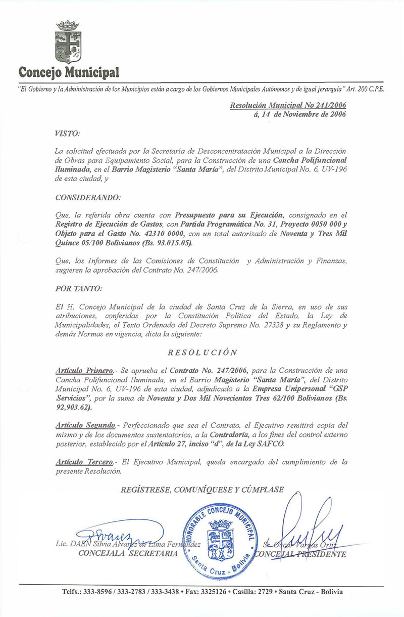 Se aprueba el Contrato No. 247/2006, para la Construcción de una Cancha Polifuncional Iluminada, en el Barrio Magisterio Santa María, del Distrito Municipal No.6, UV-196 de esta ciudad, adjudicado a la Empresa Unipersonal GSP Servicios, por la suma de Noventa y Dos Mil Novecientos Tres 62/100 Bolivianos (Bs.- 92.903.62.-).