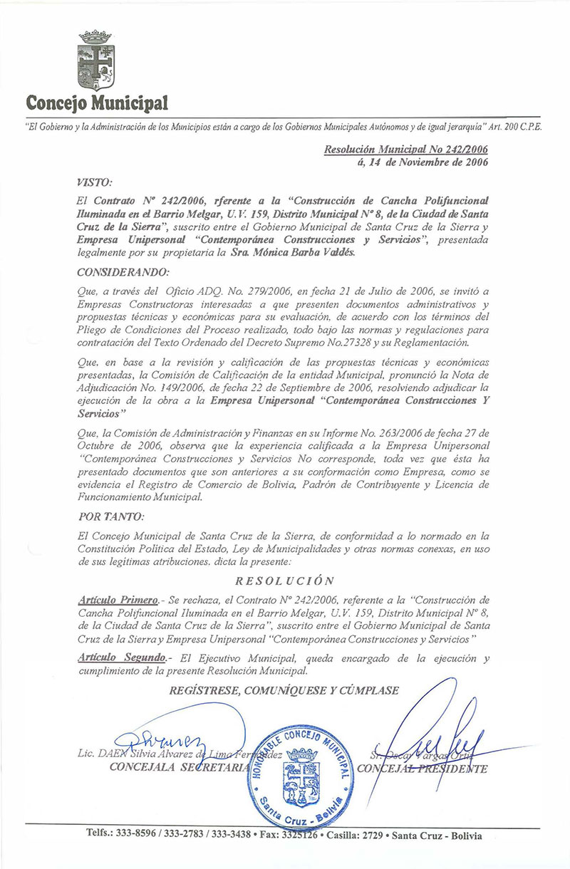 Se rechaza, el Contrato No. 242/2006, referente a la Construcción de Cancha Polifuncional Iluminada en el Barrio Melgar, UV-159, Distrito Municipal No. 8 de la ciudad de Santa Cruz de la Sierra, suscrito entre el Gobierno Municipal de Santa Cruz de la Sierra y la Empresa Unipersonal Contemporánea Construcciones y Servicios.