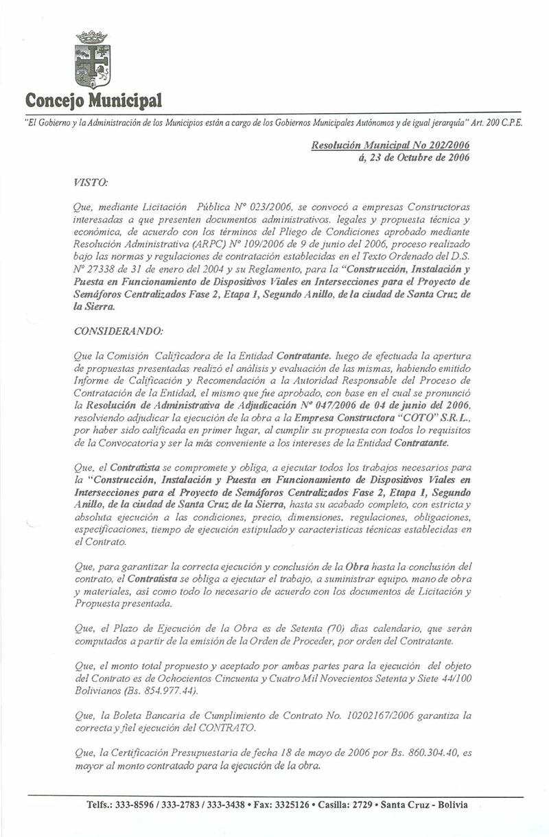 Aprueba el Contrato No. 212/2006, referente a la Construcción, Instalación y Puesta en Funcionamiento de Dispositivos Viales en Intersecciones para el Proyecto de Semáforos Centralizados Fase 2, Etapa 1, Segundo Anillo.
