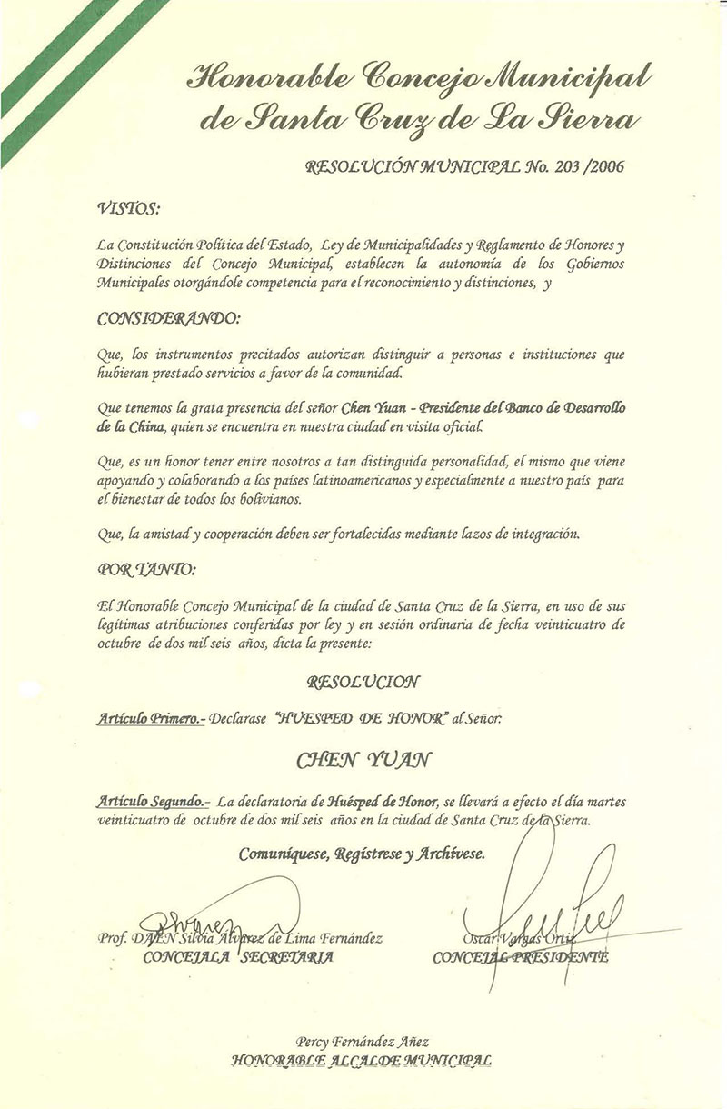 Declara Huésped de Honor al Sr. Chen Yuan, Presidente del Banco de Desarrollo de la China.