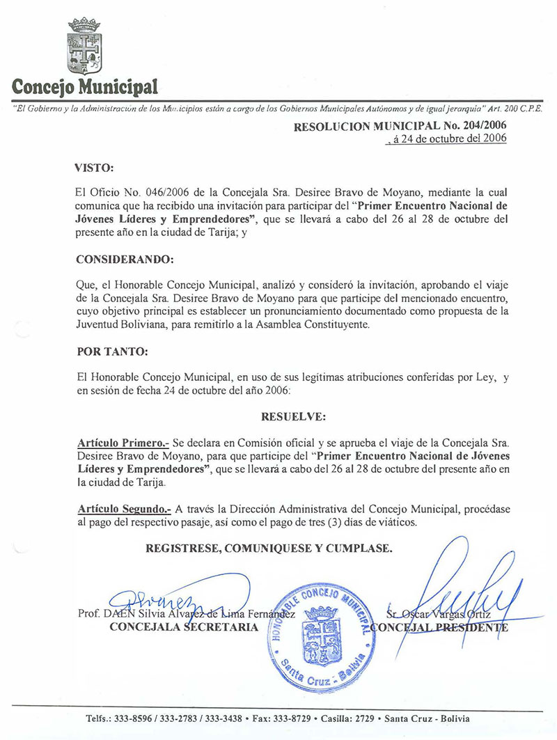 Declara en Comisión Oficial y se aprueba el viaje de la Concejala Sra. Desiree Bravo Monasterio, para que participe del Primer Encuentro Nacional de Jóvenes Líderes y Emprendedores, a realizarse en Tarija.