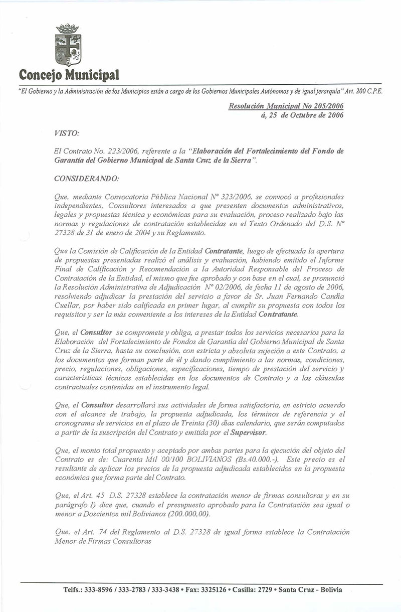 Aprueba el Contrato No. 223/2006, sobre el Servicio de Consultoría para la Elaboración del Fortalecimiento del Fondo de Garantía del Gobierno Municipal.