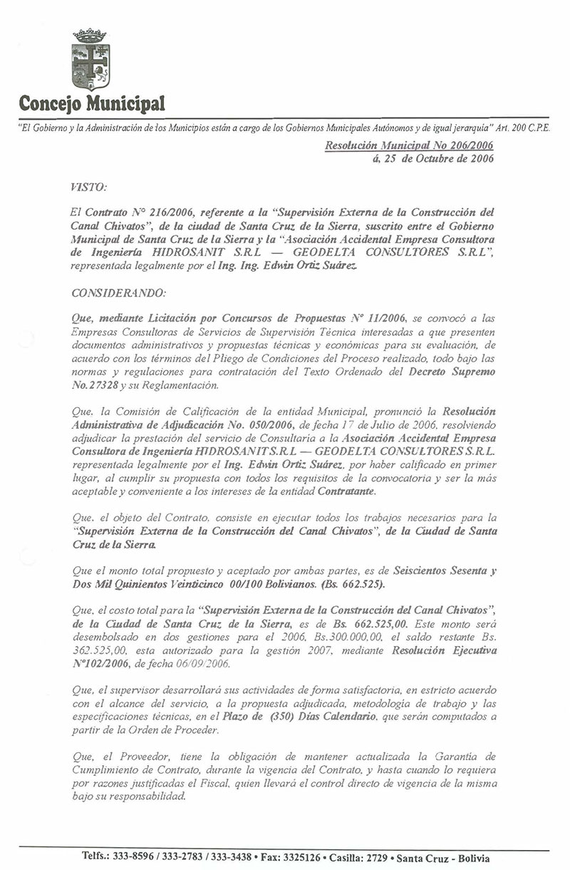 Aprueba el Contrato No. 216/2006, referente a la Supervisión Externa de la Construcción del Canal Chivato.