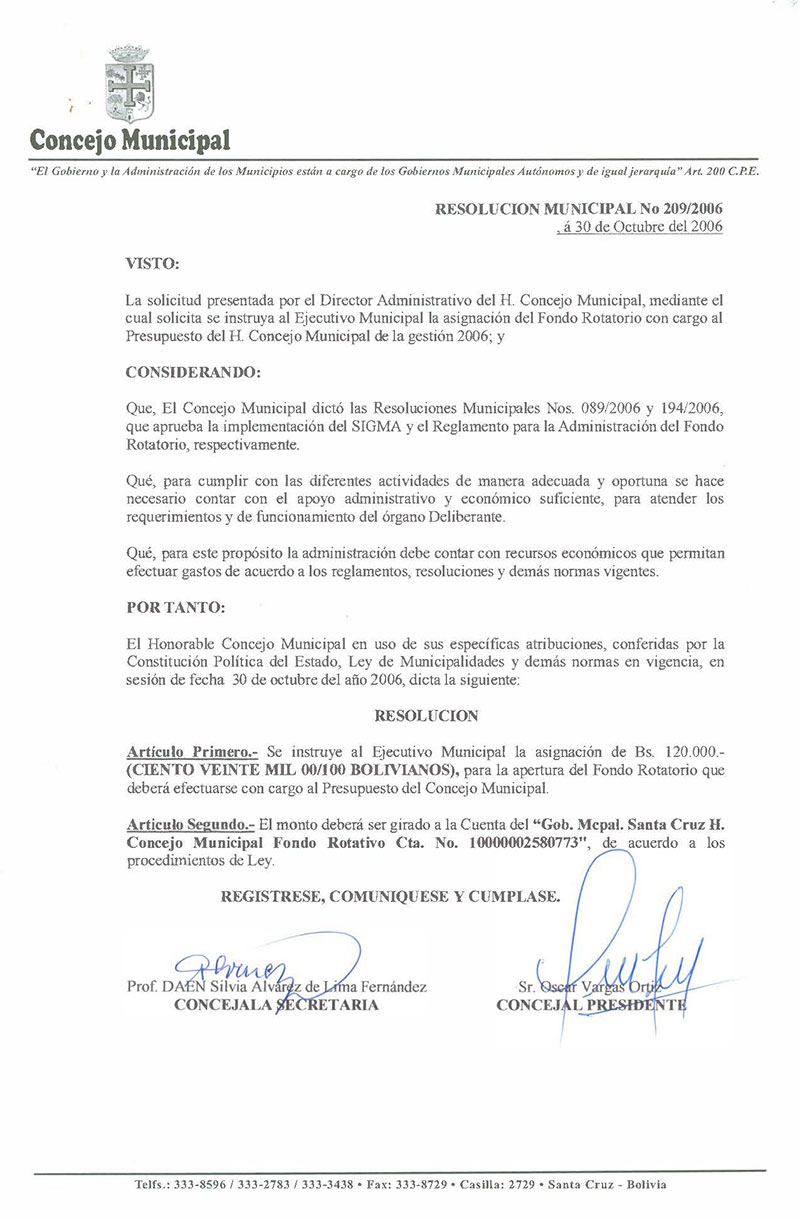 Instruye al Ejecutivo Municipal la asignación de Bs. 120.000, para la apertura del Fondo Rotatorio.