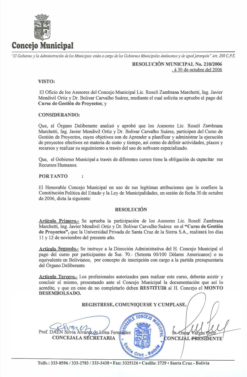 Se aprueba la participación de los Asesores Lic. Roseli Zambrana, Ing. Javier Mendivil y Dr. Bolivar Carvalho, en el Curso de Gestión de Proyectos, que auspicia la Universidad Privada de Santa Cruz.