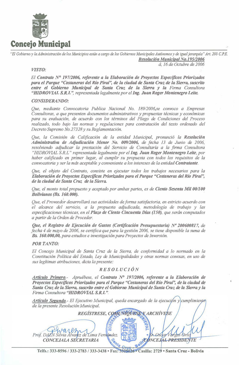 Aprueba el Contrato No. 197/2006, suscrito con la Firma Consultora HIDROVIAL S.R.L., para la elaboración de Proyectos Específicos Prioritarios para el Parque - Costaneras del Río Piraí.