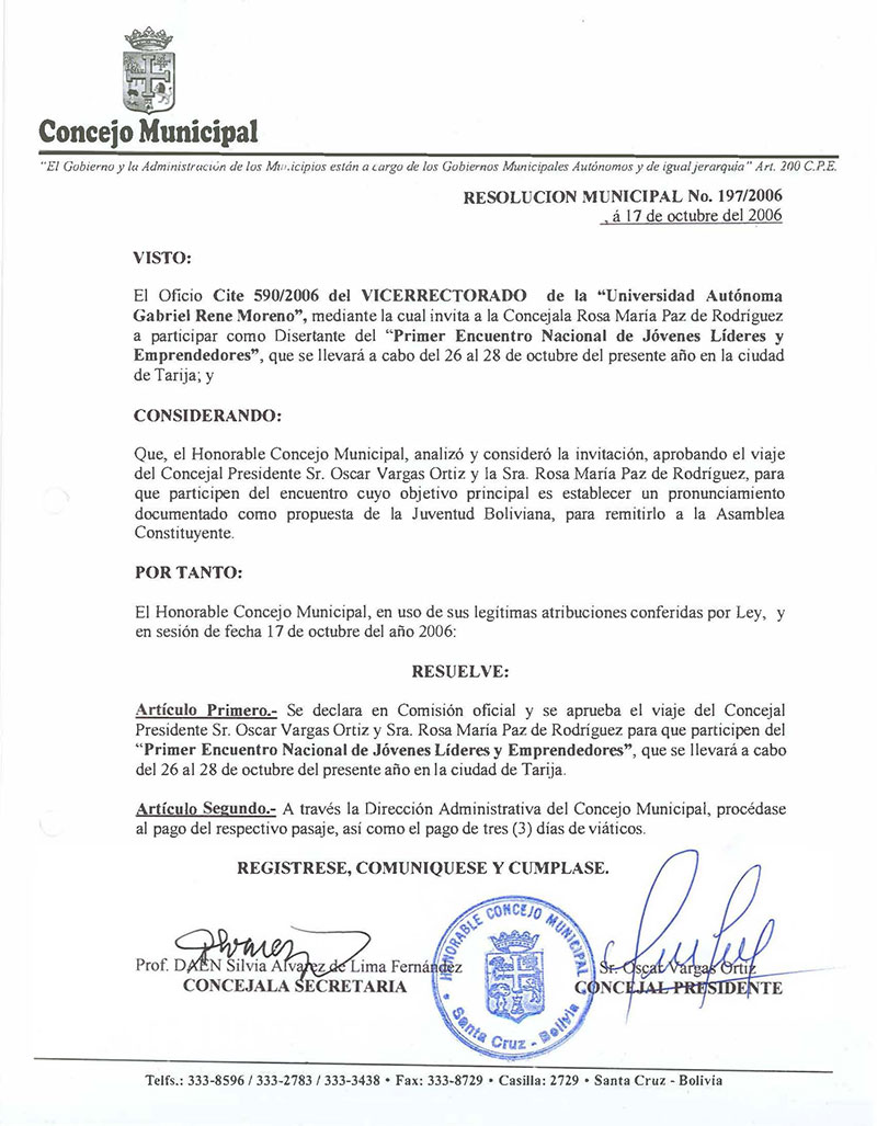 Se declara en Comisión Oficial y se aprueba el viaje del Concejal Presidente Sr. Oscar Vargas y Sra. Rosa María Paz, para que participen del "Primer Encuentro Nacional de Jóvenes Líderes Emprendedores", a realizarse en la ciudad de Tarija.