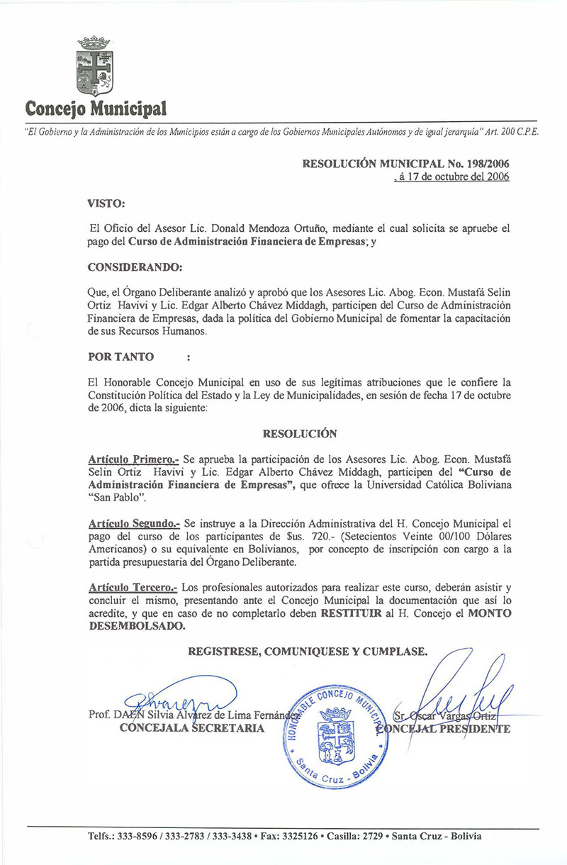 Se aprueba la participación de los Asesores Lic. Mustafá Selin Ortíz y Lic. Edgar Alberto Chávez, en el Curso de Administración Financiera de Empresas, que ofrece la Universidad Católica Boliviana.