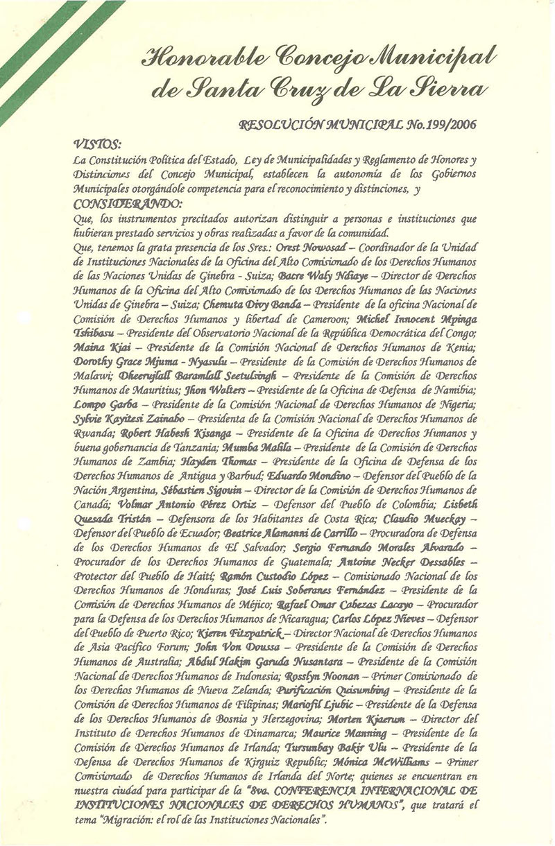 Declara "Visitantes Distinguidos" a los Señores que participa en nuestra ciudad de la "8va. Conferencia Internacional de Instituciones Nacionales de Derechos Humanos.
