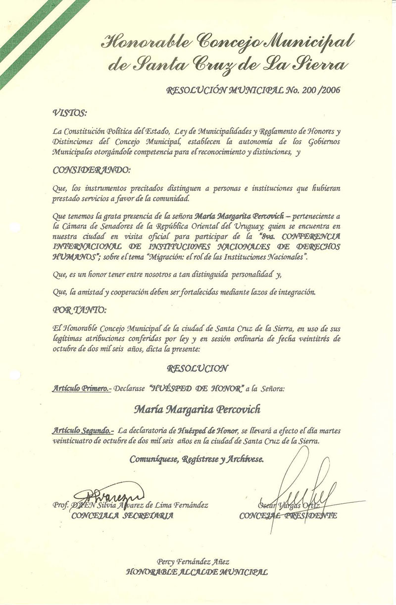 Declara Huésped de Honor a la Sra. María Margarita Percovich, Senadora de la República del Uruguay, quien participa de la 8va. Conferencia Internacional de Instituciones Nacionales de Derechos Humanos.