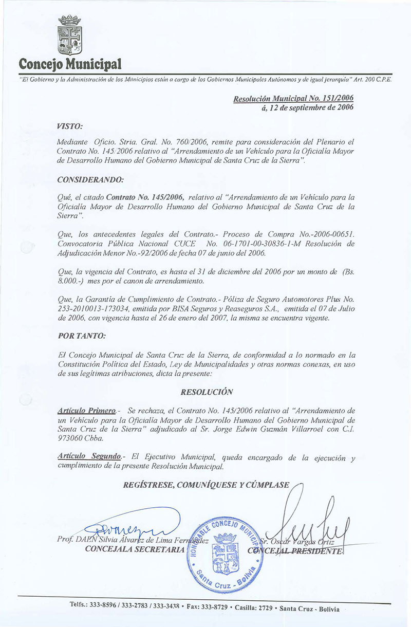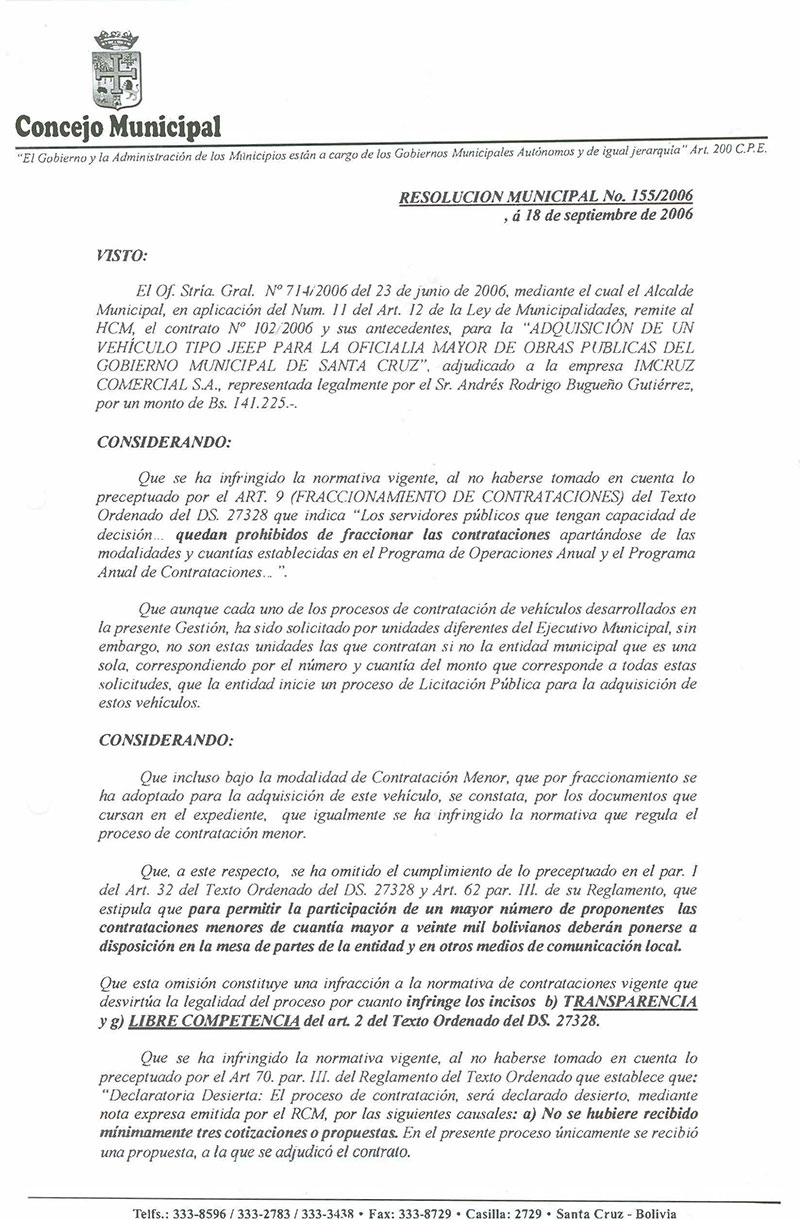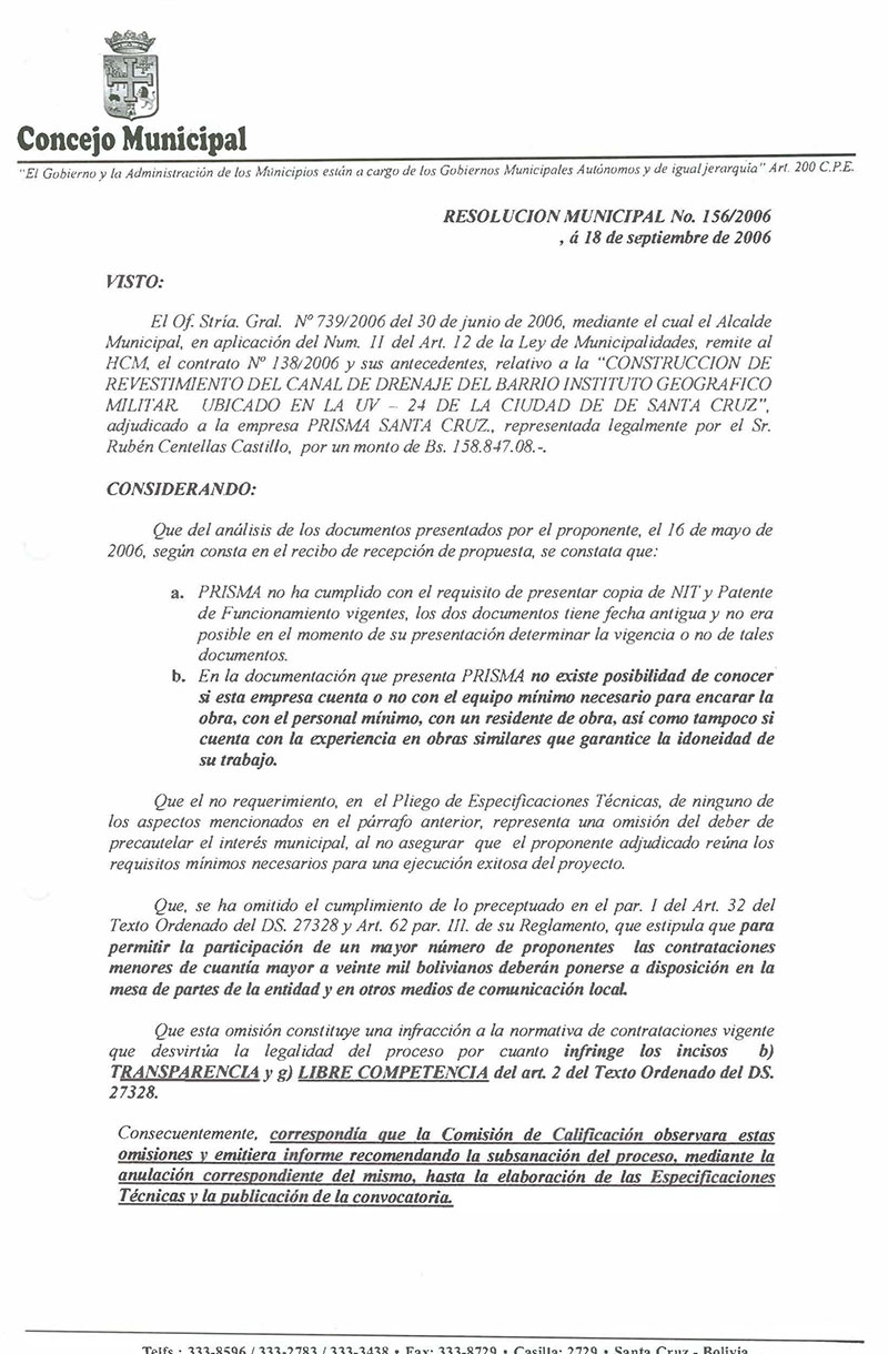 Rechaza el Contrato No. 138/2006 relativo a la construcción de revestimiento de canal de drenaje del Barrio Instituto Geográfico Militar, Empresa PRISMA SANTA CRUZ.