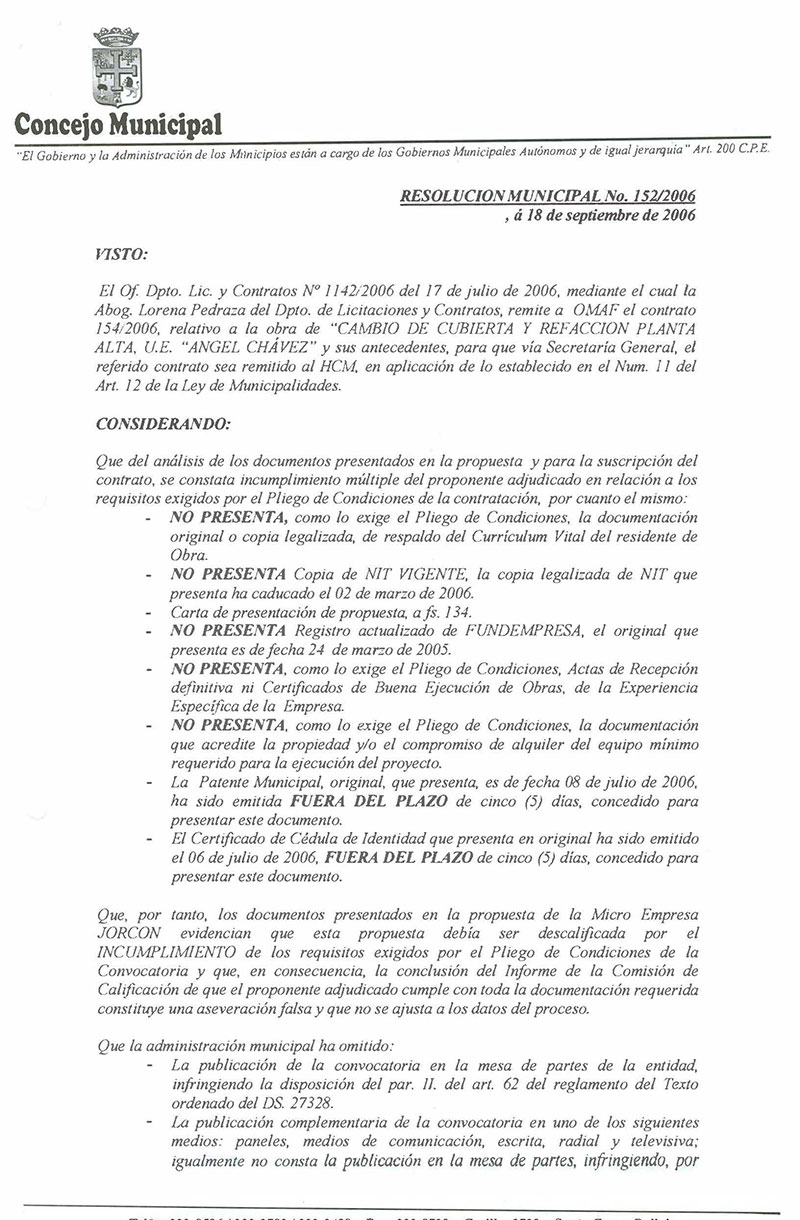 Rechaza el Contrato No. 154/2006 relativo a la obra de cambio de cubierta y refacción de planta Angel Chávez, Empresa JORCON.