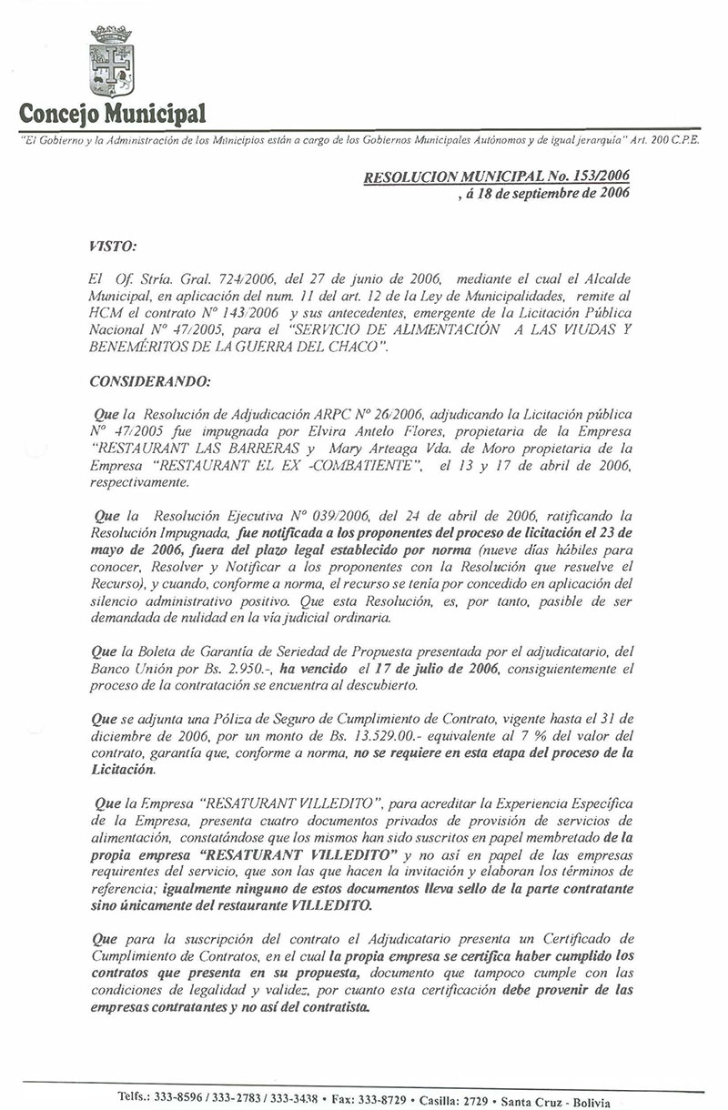 Rechaza el Contrato No. 143/2006 referente al servicio de alimentación a las viudas y beneméritos de la guerra del chaco.