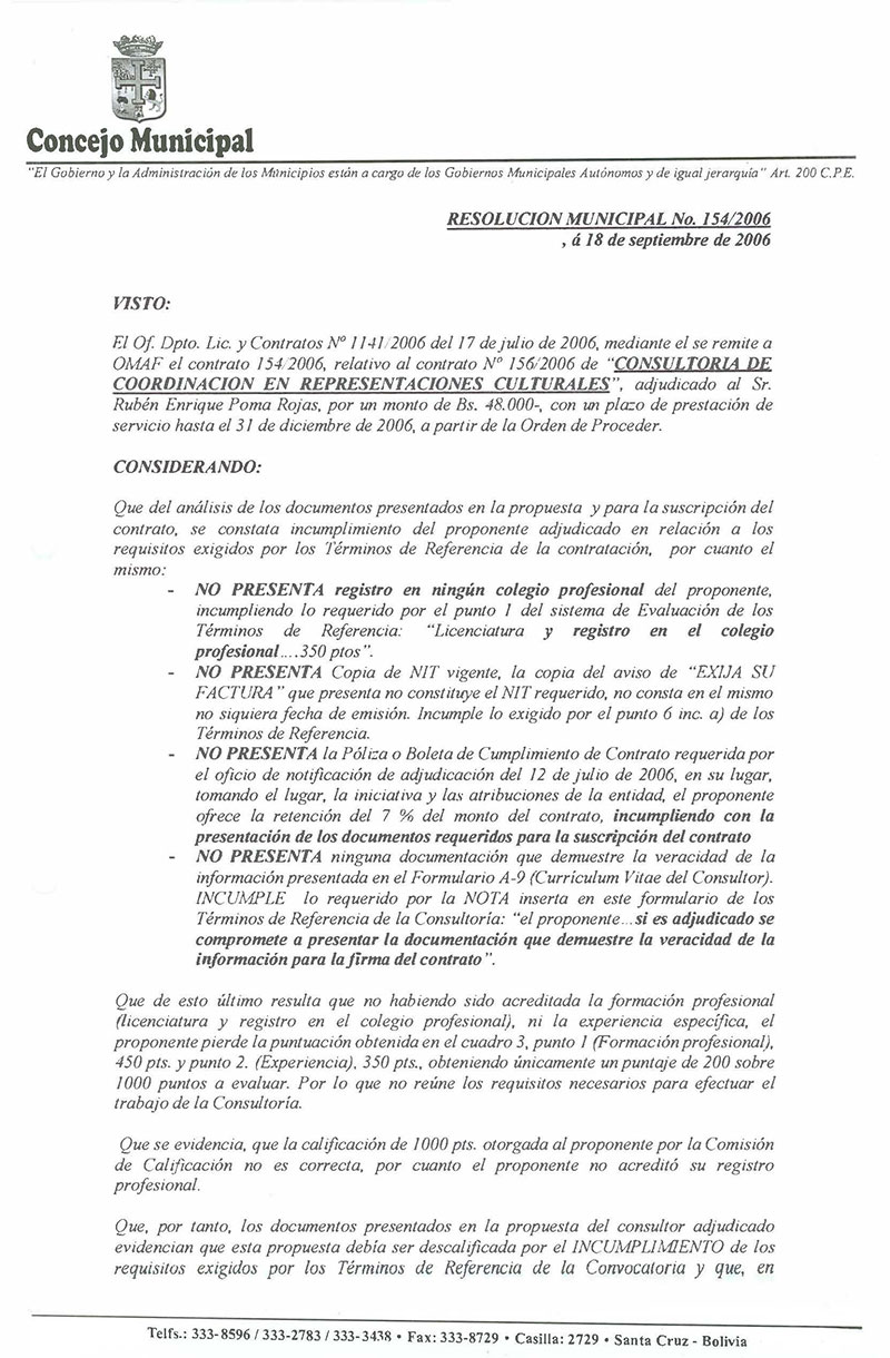Rechaza el Contrato No. 156/2006 relativo a la consultoría de coordinación en representaciones culturales.