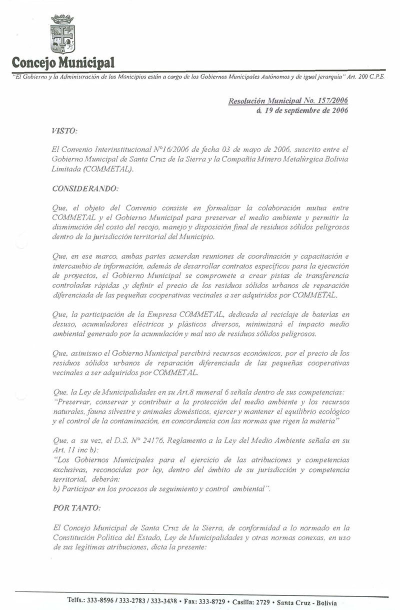 Aprueba el Convenio Interinstitucional No. 016/2006 suscrito con la Compañía Minero Metalúrgica Bolivia Limitada – COMMETAL, relativo al recojo de residuos peligrosos.