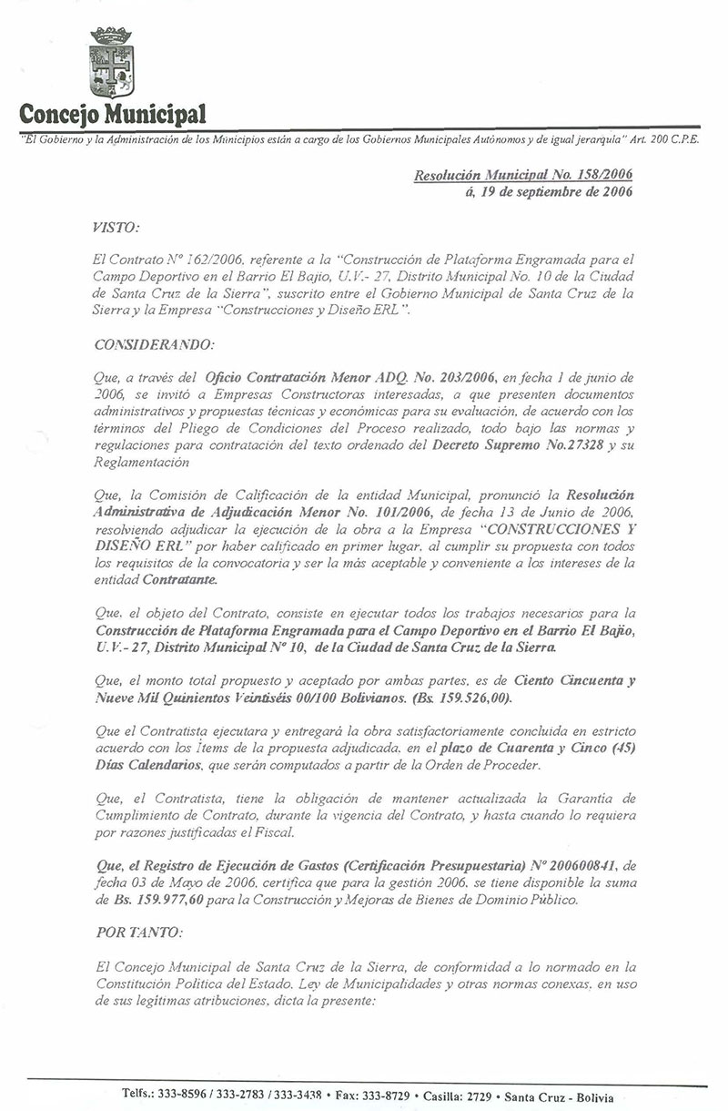 Aprueba el Contrato No. 162/2006 referente a la construcción de plataforma engramada para el Campo Deportivo en le Barrio El Bajio U.V. 27.