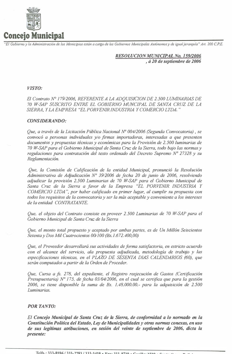 Aprueba el Contrato No. 179/2006 referente a la adquisición de 2.500 luminarias suscritos con la Empresa EL PORVENIR INDUSTRIA Y COMERCIO LTDA.